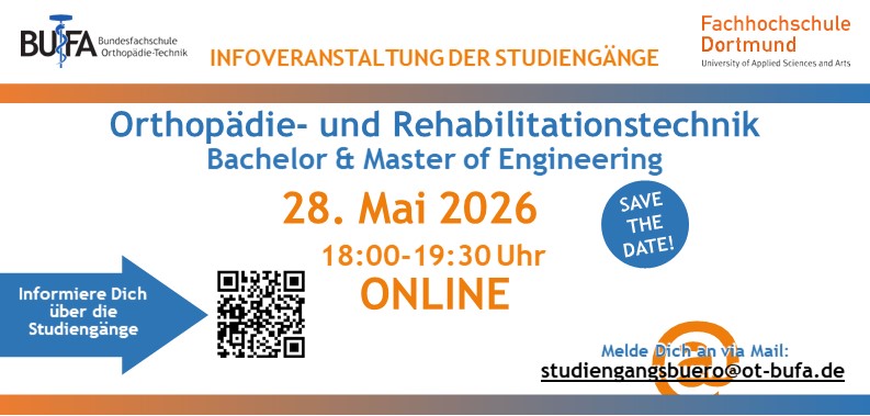Studienangebot Orthopädie- und Rehabilitationstechnik(Bachelor of Engineering)Online-Infoveranstaltung am 28. Mai 2026, 18:00 – 19:30 UhrEntdecken Sie das zukunftsorientierte Studienangebot „Orthopädie- und Rehabilitationstechnik“ (Bachelor und Master of Engineering) der Bundesfachschule für Orthopädie-Technik in Kooperation mit der Fachhochschule Dortmund.Melden Sie sich jetzt an!Die Teilnahme ist kostenlos und unverbindlich. Zur Planung und für den...